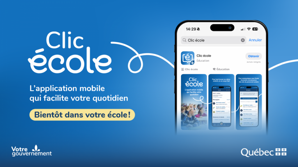 L’application mobile Clic école sera bientôt disponible pour utilisation. Elle offre un environnement sécuritaire et intuitif dans le but de faire le suivi scolaire de votre enfant tout au long de l’année à partir de votre téléphone mobile.